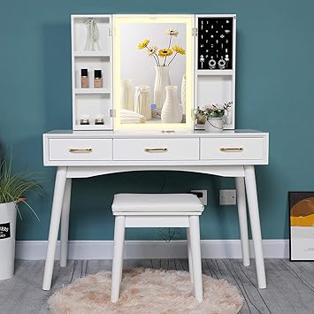 Amazon Com Fast Delivery Vanity Set With Lighted Mirror Makeup Vanity Dressing Table Dresser Desk With Large Drawer Walnut White Bedroom Furniture 12 Led Bulbs White Kitchen Dining from images-na.ssl-images-amazon.com This one is really good in terms of the quality of. Tribesigns vanity set with tri folding lighted mirror french vintage makeup vanity dressing table dresser desk with 5 drawers 8 led lights and. This vanity table setcan go with any decoration or furniture in your room, and perfect sizemakes it very suitable for limited space. I have had it for 3 months now, i'll update if anything. If you have a modern yet fabulously glam aesthetic, you need this vanity table set with 3 color lighted mirror & stool ($187). Led lighted makeup mirror, lighted vanity mirror with light 360° rotation illuminated tabletop mirror, cosmetic mirror. Trifold vanity mirror with lights led makeup mirror with lights and touch screen dimming. As an amazon associate i earn from qualifying purchases.