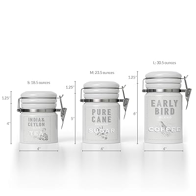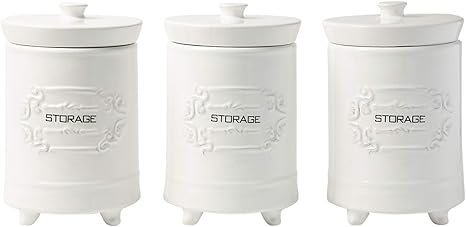 Barnyard designs decorative nesting kitchen canister jars with lids, white metal rustic vintage farmhouse container decor for flour sugar coffee tea storage, set of 4, largest is 5.5 x 11.25. White ceramic canister, old fashioned kitchen canisters, ceramic kitchen canister set, decorative canister sets kitchen, black and white. The canisters are painted with different patterns in a traditional blue color, resembling decorative tableware. These sets will create your kitchen more perfect. Decorative canister set are essential for a variety of home uses, be it in kitchens to store food items or nurseries to store crayons and other stationery.